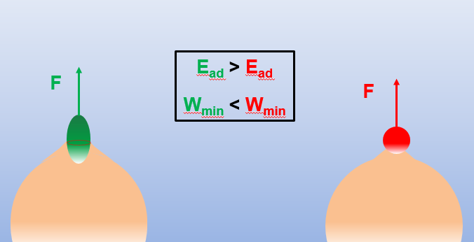[abstract] [doi]The force–displacement curve for removal of an elongated solid particle from the surface of liquid droplets or gas bubbles is calculated and compared to our previous reported results for spherical particles. The surface adsorption energy for prolate particles is known to be larger than those of spheres. We show that in fact the minimum possible work done upon removal of an elongated particle from surface can be less than that for a sphere. This result is obtained when the dissipation of interfacial energy, stored in the fluid film, attaching the particles to the surface during their displacement, is properly accounted for. This dissipation is unavoidable, even if the particles are removed infinitely slowly. Once the particle actually leaves the surface, the formed liquid bridge relaxes thus dissipating any stored interfacial energy as the surface returns to its original undistorted state. The difference between the work of removal of a particle from surface and its adsorption energy is seen to become increasingly larger with smaller particle to droplet size ratios. For example, for a size ratio of 1:100, the work of removal is 1.93 times greater than the adsorption energy. However, we also find that for any given size ratio, there is a value of particle aspect ratio for which the work of removal of particles (combined dissipated and adsorbed energy) attains its minimum value.