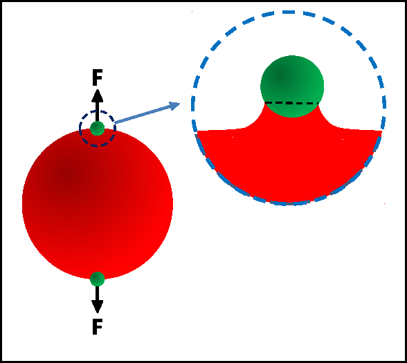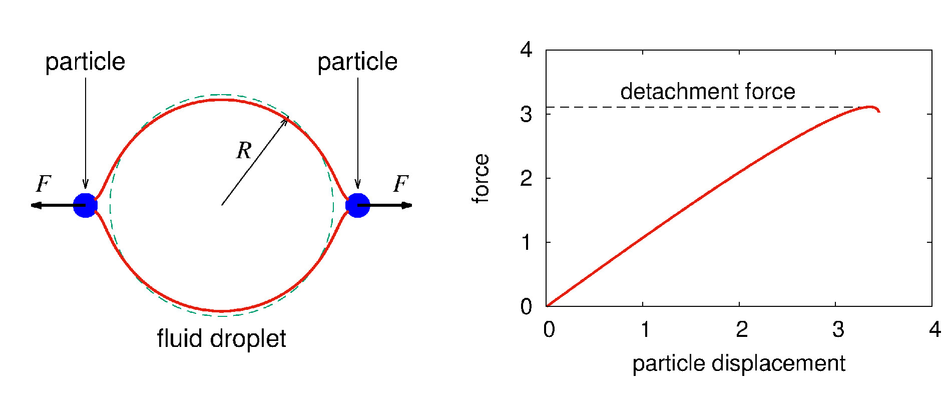 [abstract] [doi] [pdf]We calculate the deformation of a spherical droplet, resulting from the application of a pair of opposite forces to particles located diametrically opposite at the two ends of the droplet. The free-energy analysis is used to calculate the force–distance curves for the generated restoring forces, arising from the displacement of the particles relative to each other. While the logarithmic dependence of the “de Gennes–Hooke” constant on the particle to droplet size ratio, ν, is rather well known in the limit of very small ν, we find that for more realistic particle to droplet size ratios, i.e. ν=0.001 to 0.01, the additional constant terms of O(1) constitute a significant correction to previously reported results. We derive the restoring force constant to be 2πγ[0.5-ln(ν/2)]⁻¹, in perfect agreement with the exact semi-numerical analysis of the same problem. The deviation from the linear force–displacement behaviour, occurring close to the point of detachment, is also investigated. A study of the energy dissipated shows it to be an increasingly dominant component of the work done during the detachment of the particles, as ν decreases. This indicates the existence of a significantly higher energy barrier to desorption of very small particles, compared to the one suggested by their adsorption energy alone. The influence of the line tension on the detachment force is also considered. It is shown that where line tension is important, the contact angle is no longer a constant but instead alters with the displacement of the particles from their equilibrium positions.
