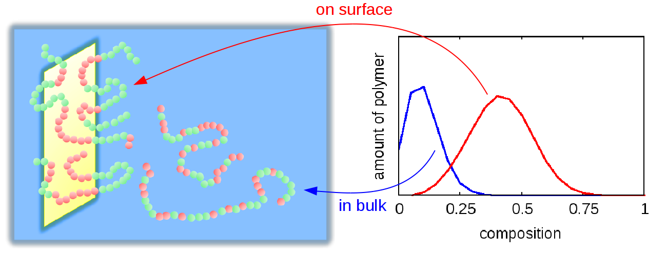 [abstract] [doi]Synthesis of random copolymers leads to a structurally polydispersed distribution of polymer chains, where one of the constituent monomers prefers residing on the interface, while the others have a tendency for remaining in the bulk. Previous studies have demonstrated the very strong dependence of the level of adsorption with the degree of blockiness and number of adsorbing residues of the chains. Using self-consistent field calculations, we obtain the distribution of the adsorbed copolymers and compare this with the bulk distribution of such chains. In our study, the whole range of structurally polydisperse chains in the distribution derived for a given random copolymer are simultaneously present and can compete with each other for adsorption. We show that the distribution of chains on the surface is grossly different to that in the bulk and is largely dominated by those rare chains at the tail end of the latter distribution.